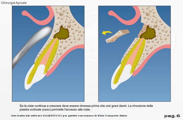 Si tratta della "devitalizzazione" dell'elemento dentario gravemente compromesso da un processo carioso che ha raggiunto la polpa o in seguito a un trauma che ha provocato la necrosi (morte) della polpa stessa; se il dente non e' gia' morto spontaneamente da tempo e non ci sono quindi infezioni a livello dell'osso che circonda intimamente le radici, l'operazione puo' richiedere da 1 seduta per i denti con una sola radice e un solo canale, a 2-3 sedute per gli elementi pluriradicolati, con 2, 3 o piu' canali.